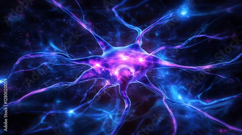 Abstract neural network glowing in electric blue and purple, futuristic AI concept.