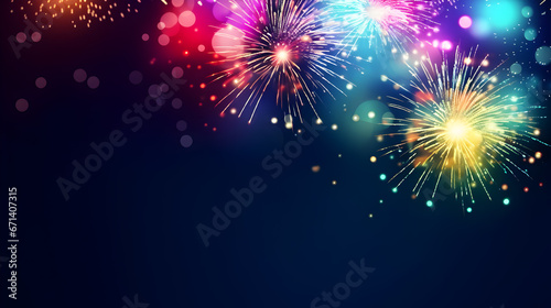 Abstract new year background with colorful fireworks and christmas lights,Red, white, and blue fireworks light up the night sky, patriotic celebration, New Years Eve or Independence Day. Shallow depth