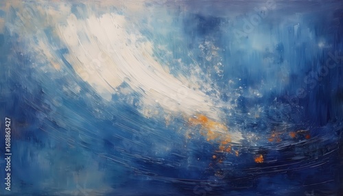 abstract ocean wave swirl with bright white crest and golden foam in textured deep blue brushstrokes for modern wall art or book cover