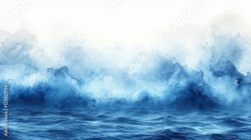 Abstract ocean waves with a gradient of blue hues and soft clouds.
