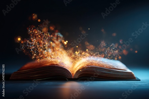 Abstract open book glowing with particles and symbols, visualizing modern educational advancements.