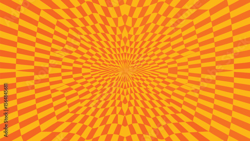 Abstract orange and yellow checkered pattern with a central focal point perspective design effect
