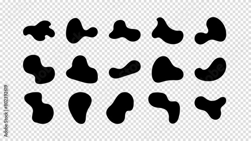 Abstract organic black fluid blobs irregular shapes set of collection for speech bubbles. Liquid shapes, round abstract elements. Simple blotch water forms. Vector illustration on a transparent bg.