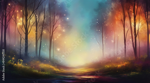 Abstract painting art style image of a forest with colorful lights and bokeh, colorful fog and lights landscape
