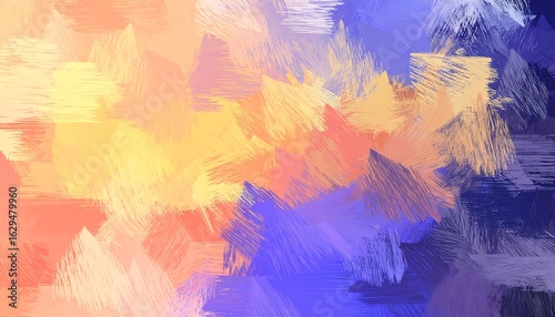 Abstract painting with vibrant, overlapping brushstrokes in orange, yellow, and blue hues.