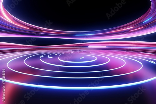 Abstract panoramic background of twisted dynamic neon lines glowing in the dark room with floor reflection. Virtual fluorescent ribbon loop. Fantastic minimalist wallpaper