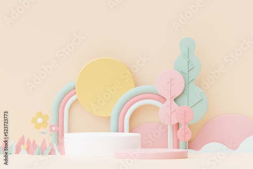 Abstract Pastel of nature, flowers leaves and tree plants with Podium stand platform. Cute Cartoon natural landscape background. Scene of spring colorful plants with minimal design. 3D Render.