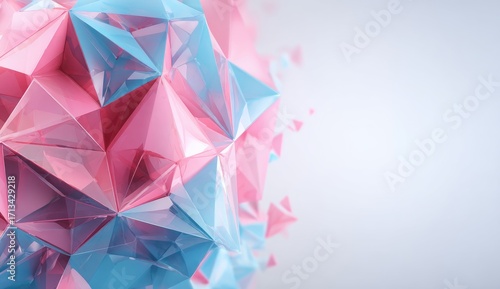 Abstract pastel pink and light blue geometric sphere, composed of numerous translucent triangular facets, partially disintegrating into smaller fragments against a soft, light gray background