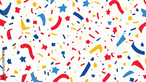 abstract pattern with confetti and ribbons in red, blue, and yellow colors on a white background. Minimalist style for celebration or party design. Vector illustration