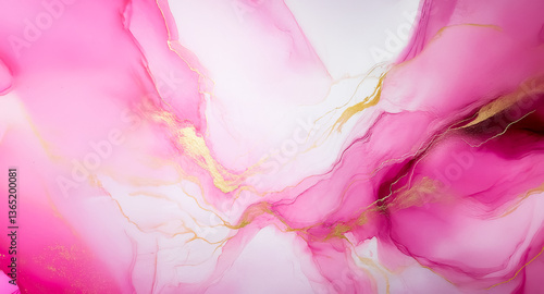 Abstract pink and white fluid art with gold accents creating a dreamy, flowing texture. Soft, elegant, and visually appealing with a delicate marble-like effect.