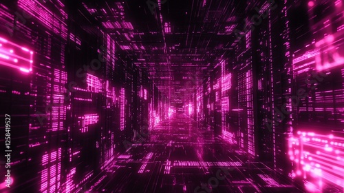 Abstract pink digital tunnel with glowing lines and data streams.