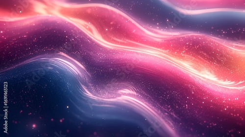 Abstract pink, orange, and blue wavy liquid light background with glitter.