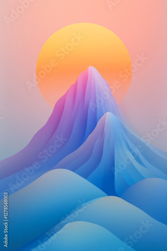 Abstract polygonal cliffs in bold gradient tones, topped by a sun so luminous it creates prismatic