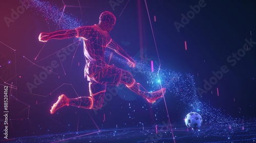 Abstract Polygonal Football, Soccer Player in Mid-Action, Hitting the Ball with Neon Gradient Wireframe Cybernetic Particles