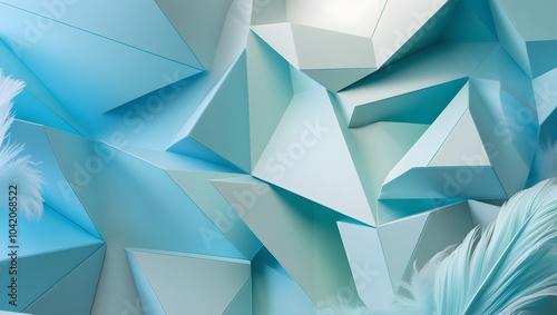 Abstract polygonal shapes in cool blue tones, arranged in a 3D perspective with soft shadows.