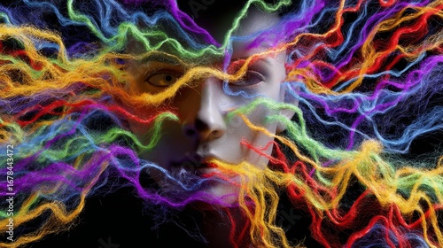 Abstract Portrait of a Face Surrounded by Colorful Flowing Wires Creating a Vibrant Atmosphere