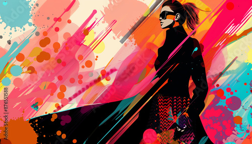Abstract portrait of a woman in a coat with a colorful and dynamic background