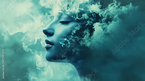 Abstract portrait of a woman with blue and green clouds. Concept of dreams, imagination, fantasy, and spirituality.