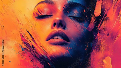 Abstract portrait of a woman with closed eyes and colorful paint splatters around her face
