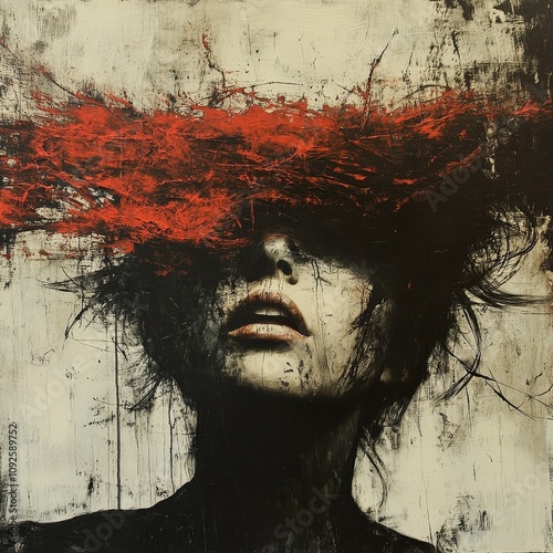 Abstract portrait with striking red elements, evoking emotion and mystery. A unique blend of art and expression.