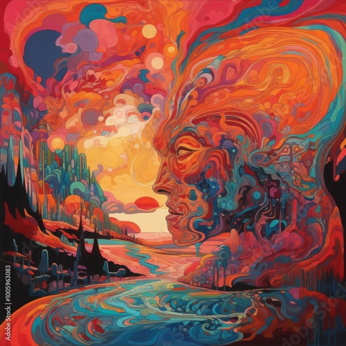 Abstract portrait with vibrant colors and surreal landscape elements.