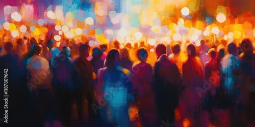 Abstract portrayal of a crowded business meeting featuring blurred individuals and vibrant lights.