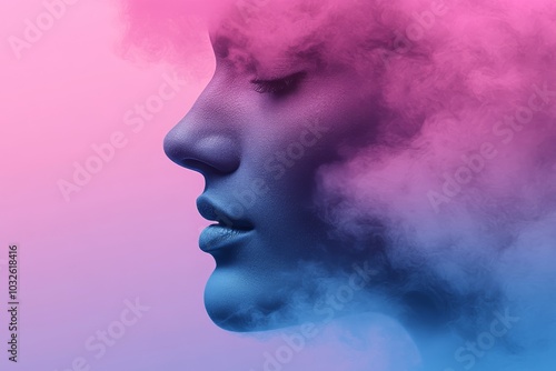 Abstract profile of a womans face dissolving into blue and pink smoke symbolizing creativity transformation and the fluid nature of thought in a dreamlike surreal atmosphere