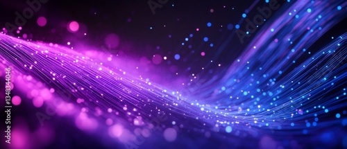 Abstract purple and blue glowing fiber optic strands with bokeh lights