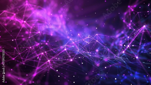 Abstract purple and blue network with glowing nodes and lines against a nebula background design