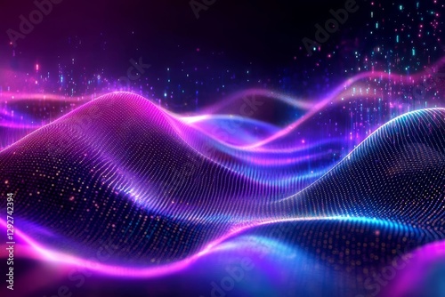 Abstract Purple and Blue Wave Particle Composition, Digital Art, Data Visualization, Glowing Energy, 3D Render, Waveform Data Visualization, Abstract Art
