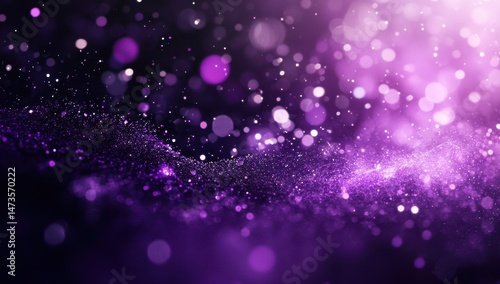 Abstract purple background with shimmering particles and bokeh. A dynamic display of swirling, textured particles in shades of violet and deep purple, accented by glowing light effects