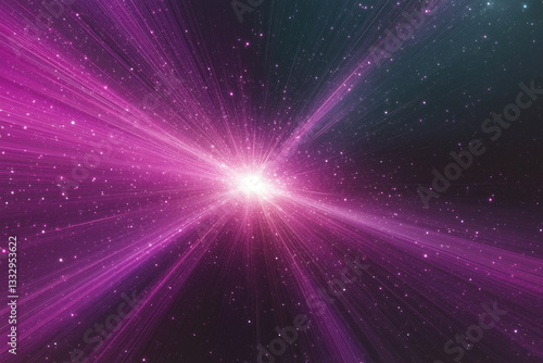 Abstract purple space background with bright light emanating from a central point and stars around