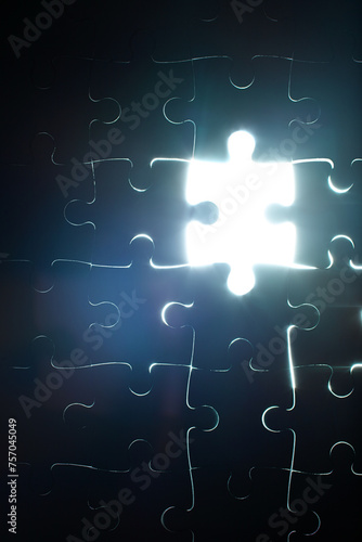 Abstract, puzzle and piece missing in problem solving and solution to challenge with strategy or planning. Jigsaw, games or shape of idea to glow in light of dark or search for innovation in business