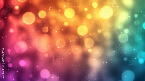 Abstract rainbow bokeh background with colorful circles and sparkles.