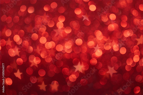 Abstract red background with defocused lights and bokeh in the shape of star. Holiday background.