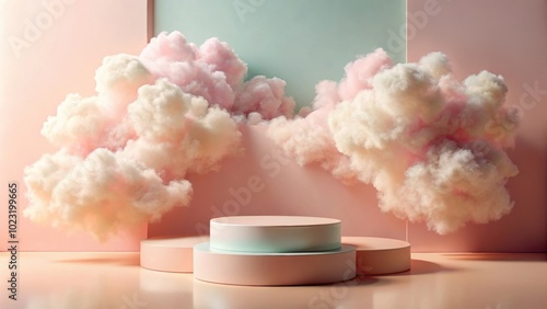 Abstract rendering of a minimal scene with a product podium and fluffy clouds in pastel colors for product display
