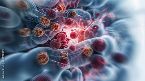 Abstract representation of a bacterial infection spread inside the human body, visualized with vibrant colors and sharp details.