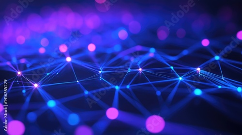 Abstract representation of a digital network with glowing blue and purple nodes interconnected by vibrant lines on a dark background, symbolizing technology and connectivity