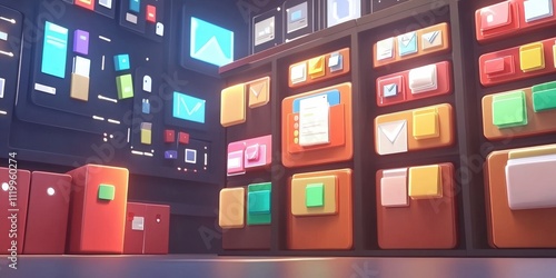 Abstract representation of a futuristic network grid showcasing colorful folders and files in a digital environment with vibrant technology elements