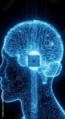 Abstract representation of a human head with glowing blue digital circuits and a central processor symbolizing artificial intelligence.