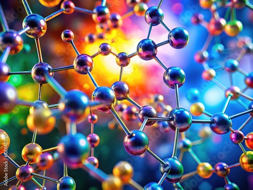 Abstract representation of chemical structure with colorful molecular connections and formulas on background