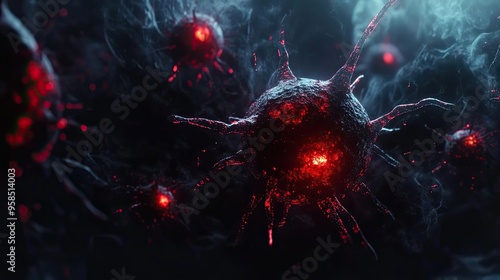 Abstract representation of dark, red microorganisms in a mysterious environment, showcasing intricate details and vivid colors.