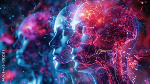 Abstract representation of human heads with neural and vascular elements in vibrant colors.