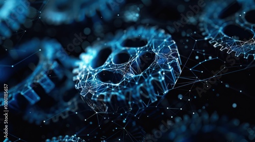 Abstract representation of interconnected gears with a digital, high-tech aesthetic.