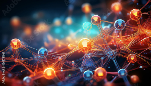 abstract representation of interconnected molecules in a dynamic microcosm showcasing reflections and vibrant colors in a scientific exploration of atomic structures