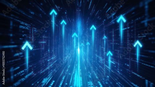 Abstract representation of upward movement with digital elements and arrows.