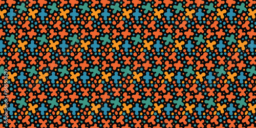 Abstract Retro Pattern with Crosses and Dots in Orange, Blue, and Yellow on a Black Background