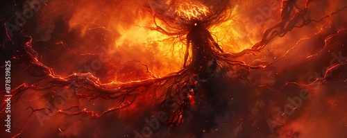 Abstract Satan with fiery tendrils reaching out from a dark distorted form surrounded by a haze of red and black