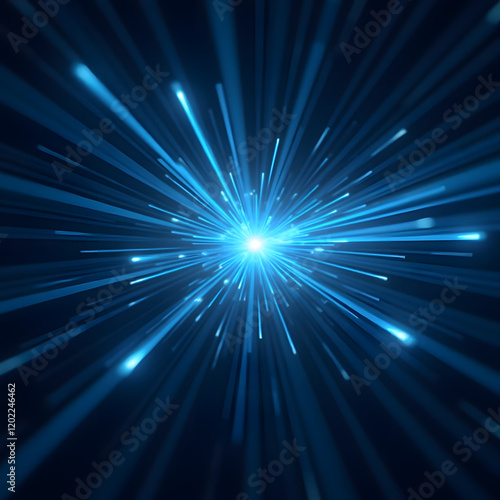 Abstract, science, futuristic, energy technology concept. Digital image of light rays, stripes lines with blue light, speed and motion blur over dark blue background