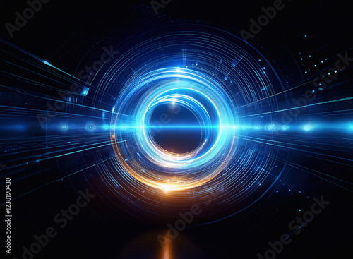 Abstract sci-fi background featuring a double exposure of glowing blue and orange rings, creating a futuristic, technological portal effect.